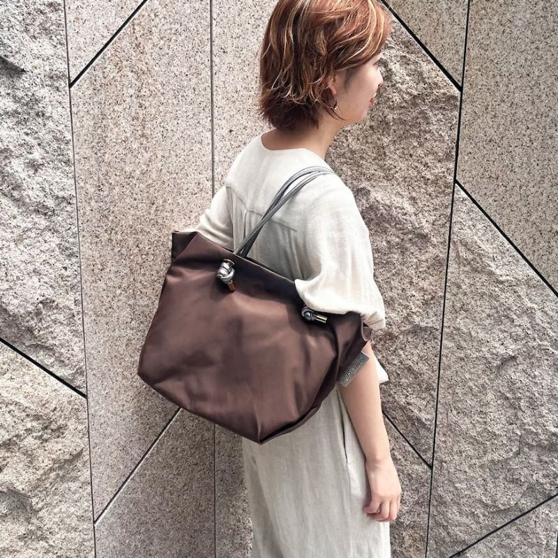 シンプルなデザインのボディにメタリックレザーのノットハンドルがアクセントになったトートバッグのMサイズ。