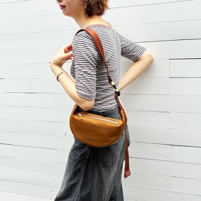 弱撥水性のあるカジュアルなナイロン素材に金具のゴールド使いが女性らしいボディバッグ。