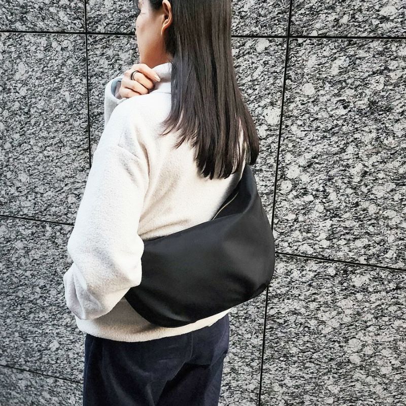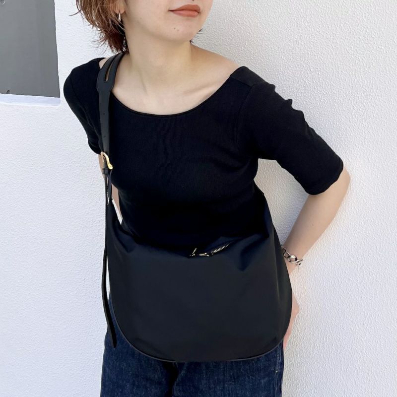 弱撥水性のあるカジュアルなナイロン素材にレザーのショルダーベルトの組み合わせが上品なボディバッグ。