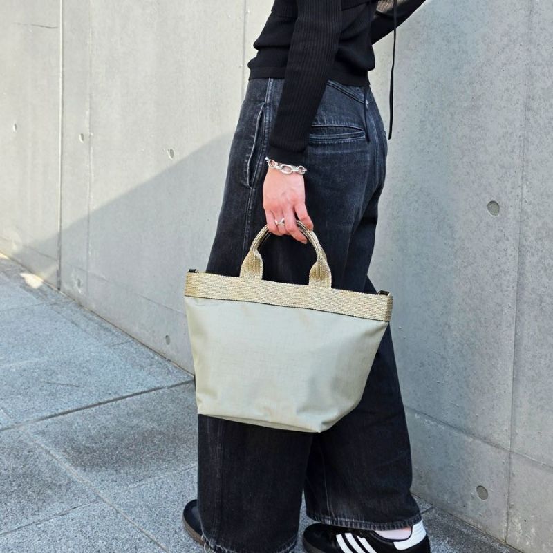 ムラ感と凹凸のあるナイロン生地は丈夫で上品なカジュアル感があり、ゴールドのテープハンドルが女性らしい雰囲気です。