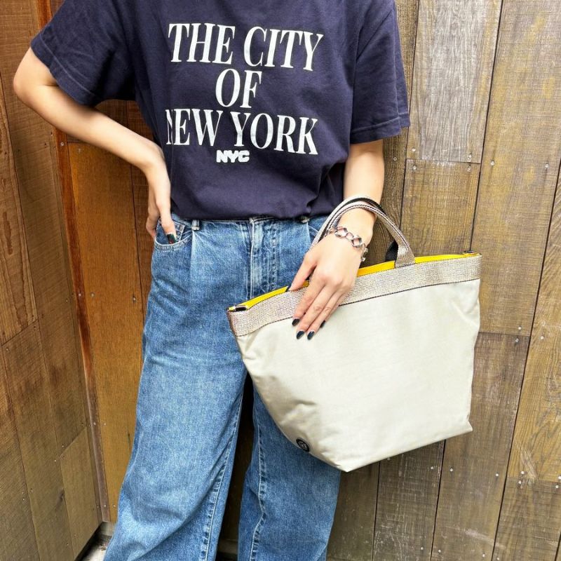 ムラ感と凹凸のあるナイロン生地は丈夫で上品なカジュアル感があり、ゴールドのテープハンドルが女性らしい雰囲気です。