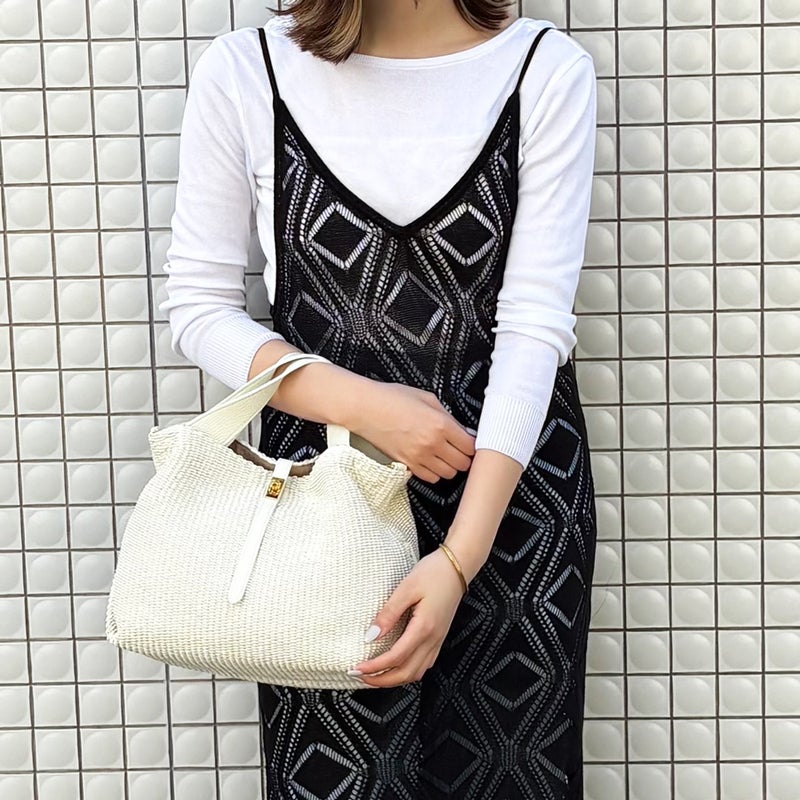 天然素材ではなくラフィア調の生地を使用することで、従来の手編みのカゴバッグでは表現しづらいトレンド感のあるクリーンなデザインに。