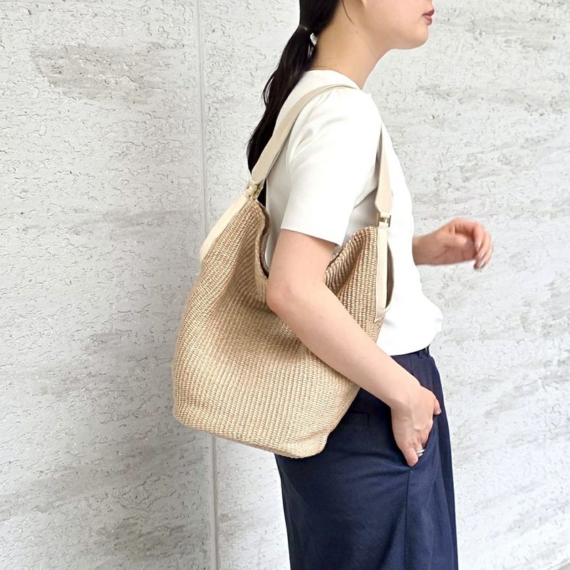 天然素材ではなくラフィア調の生地を使用することで、従来の手編みのカゴバッグでは表現しづらいトレンド感のあるクリーンなデザインに。
