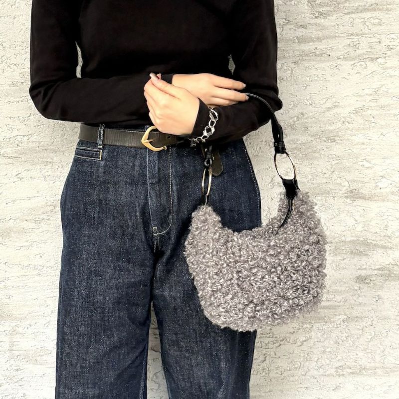 モコモコしたカールが魅力のカルガンラムタイプのエコファーを使用した三日月型2WAYポシェット。