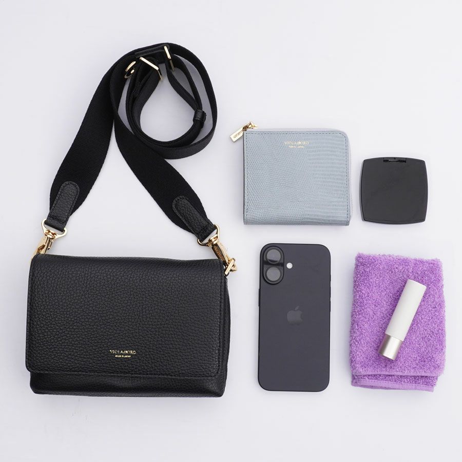 コンパクトな見た目ながらも二つ折り財布や携帯など身の回りのものを整頓しながら収納可能。