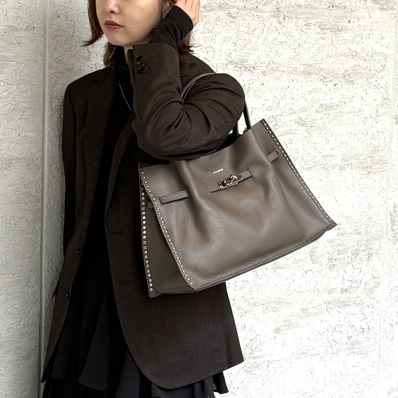 重厚感のあるスタッズを効かせたベルト付きトートバッグのLサイズ。
