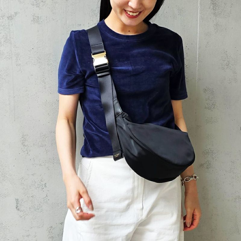 弱撥水性のあるカジュアルなナイロン素材に金具のゴールド使いが女性らしいボディバッグ。