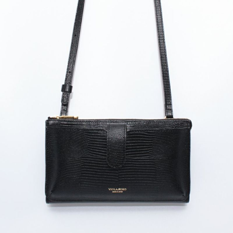 リザードの型押しレザーが女性らしい、横型のスマートフォンポシェット。