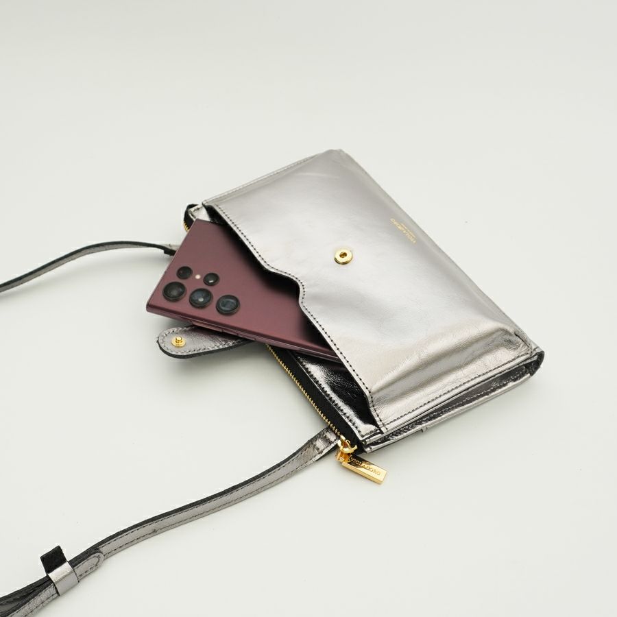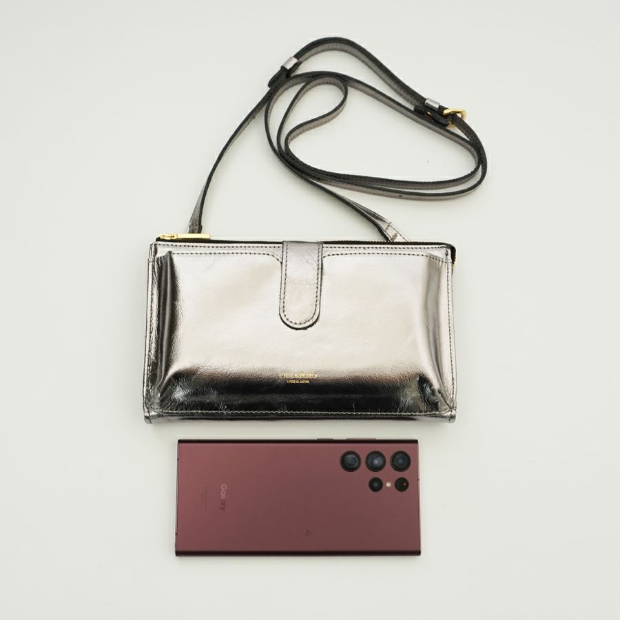 イタリアンメタリックレザーの横型スマートフォンポシェット。