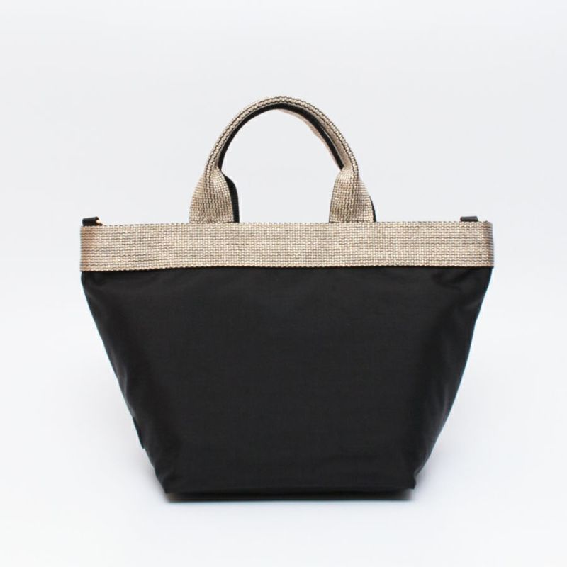 ベーシックなフォルムにゴールドのテープが印象的なナイロントートバッグのMサイズ。
